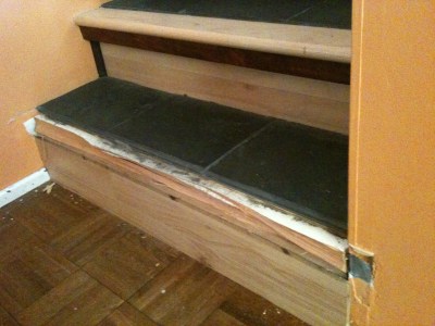 This is supposedly physically impossible. But the wood of this step was nothing when met with my hubs’ ass. It snapped right off – the step, not hubs’ ass.