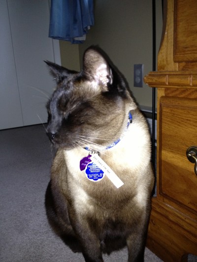 This handsome kitty learned how to work the neighbours for treats. We kept him on diet cat food but it did no good. Until we put this tag on his collar, ” vet says I’m fat.”