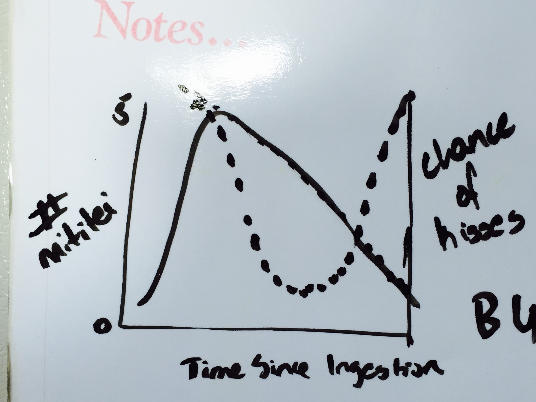 This graph illustrates the “mititei effect” whereby chances of kisses decreases with the number consumed and with the proximal time since ingestion.